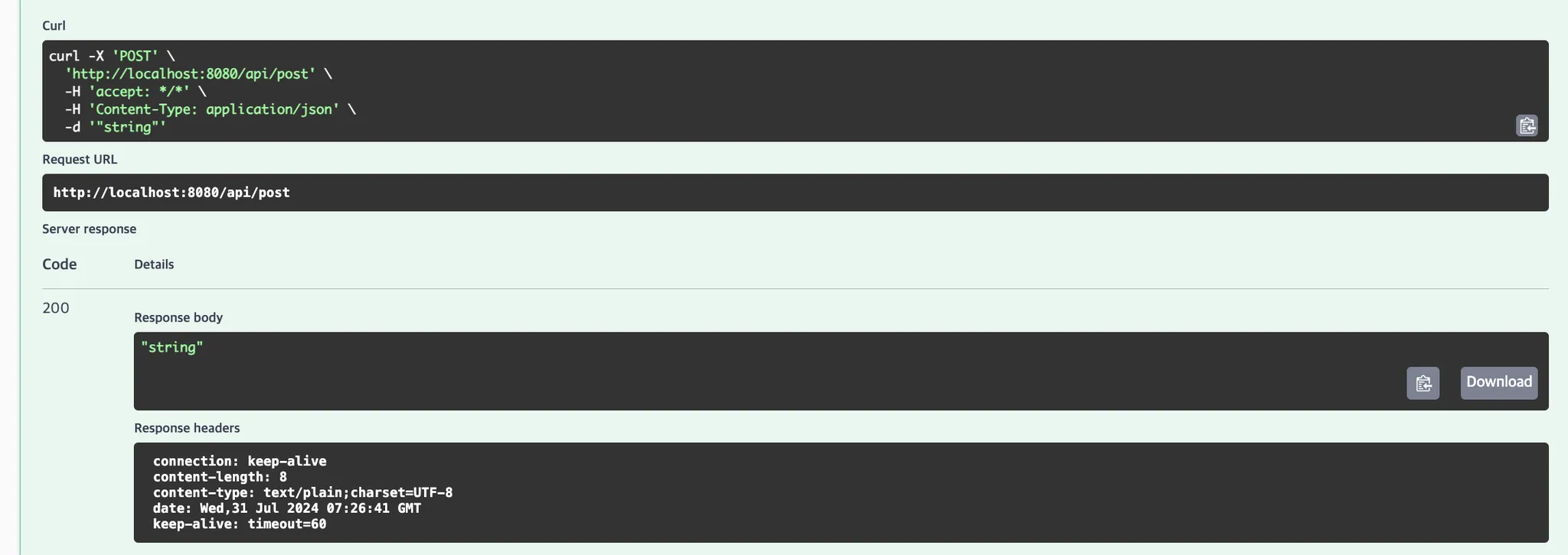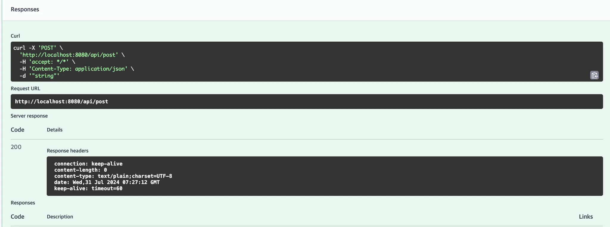 위와 같이 코드를 작성하면 요청/응답 로그는 출력이 되는 것을 확인할 수 있지만, 실제로 요청을 보낸 클라이언트(스웨거)에는 반환 값이 전달이 되지 않는 것을 볼 수 있다.