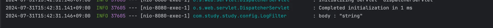 하지만 위와 같이 doFilter를 추가해도 동일하게 body 값만이 출력이 되고 Controller에 요청이 전달되지 않는 것을 확인할 수 있다.