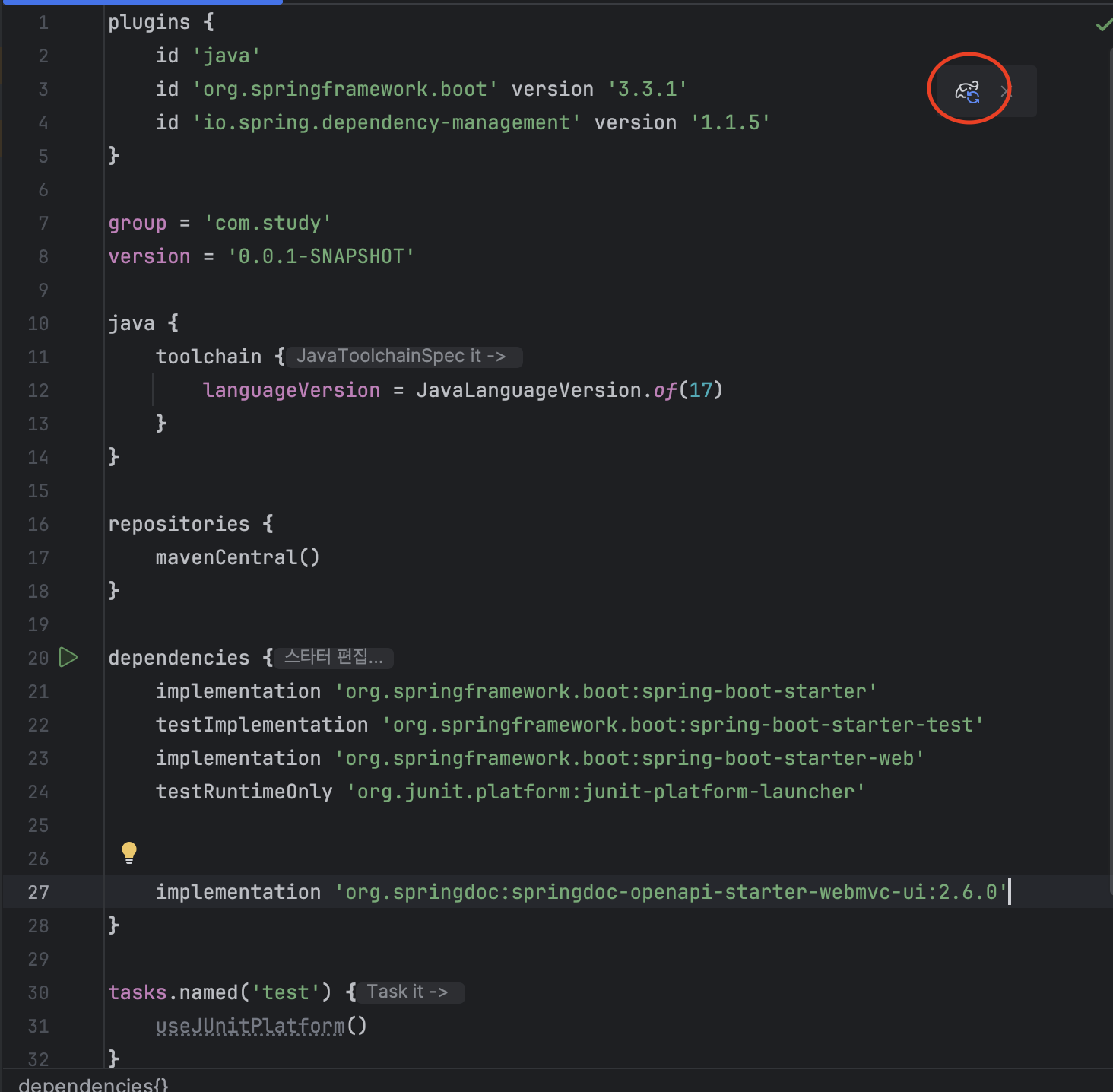 해당 의존성을 build.gradle 등의 파일에 추가하고 오른쪽 상단에 보이는 버튼을 누른 후 코드를 실행 시키게 되면 http://localhost:8080/swagger-ui 주소에 접속할 수 있는 것을 확인할 수 있을 것이다!
