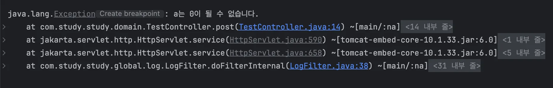로그에는 설정한 Exception에 대한 정보가 표시가 되지만, 실제 반환 되는 값에는 이러한 정보가 포함되지 않은 것을 확인할 수 있을 것이다.