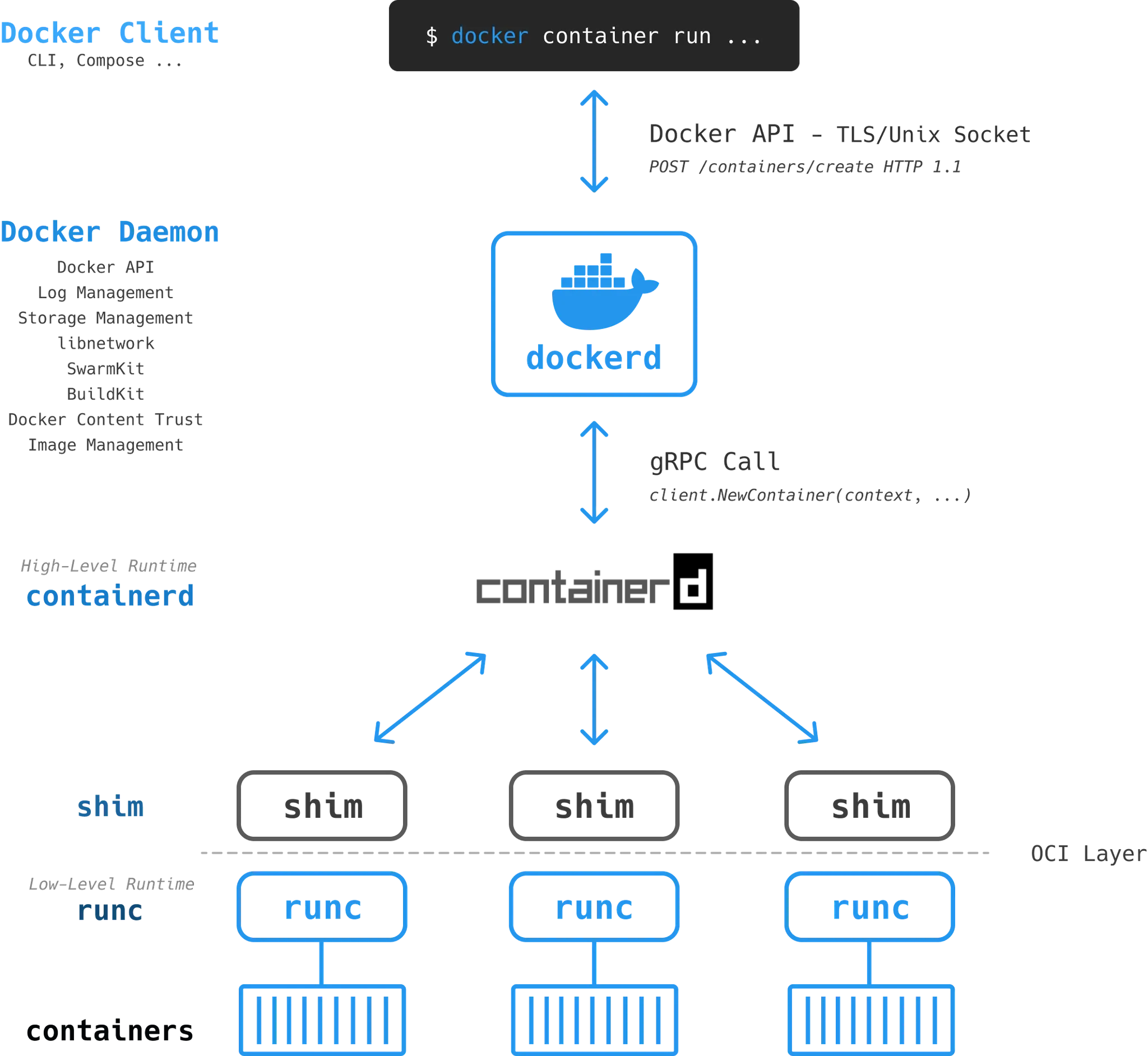 OS 커널에 접속, 컨테이너를 만드는데 필요한 구성요소를 묶어 컨테이너를 생성 후 종료