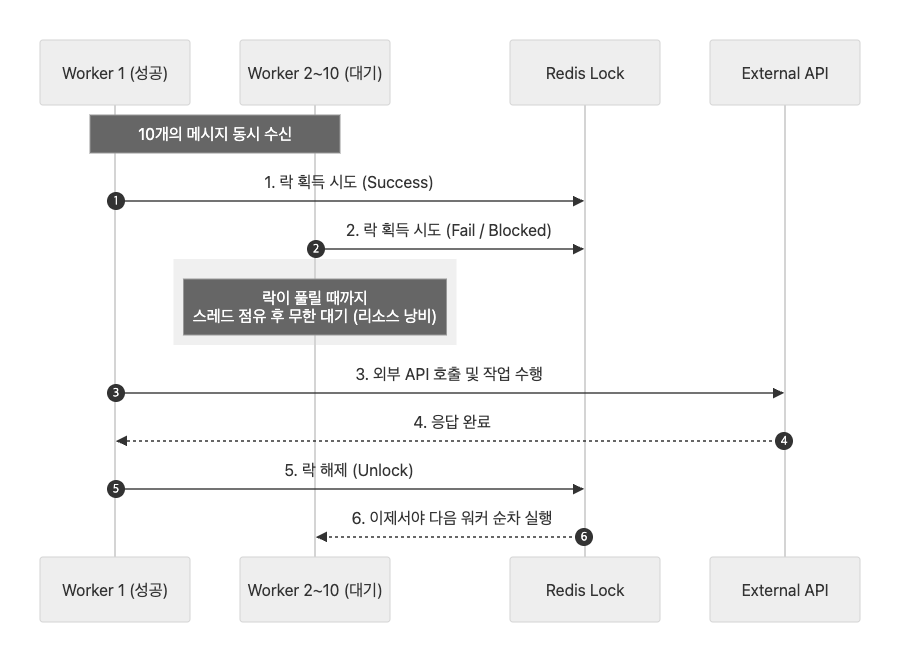 예를 들어 한 명의 사용자가 10개의 메시지를 발행하면 10개의 리스너가 이를 각각 수신한다. 하지만 락 때문에 1개의 리스너만 API를 호출하고, 나머지 9개는 락이 풀릴 때까지 아무런 동작도 못한 채 점유만 하고 대기하게 되어 리소스를 낭비하게 된다.